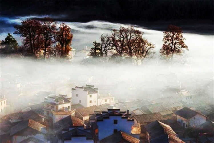 徽州的秋天静谧而有诗意,绚烂却不矫情,满山秋叶、色彩斑斓,粉墙黛瓦掩映其中,云雾缭绕若隐若现,红枫丛中忽露出飞檐翘角,粉墙黛瓦在金黄叶子的掩映下,就如中国山水画般诗情画意。