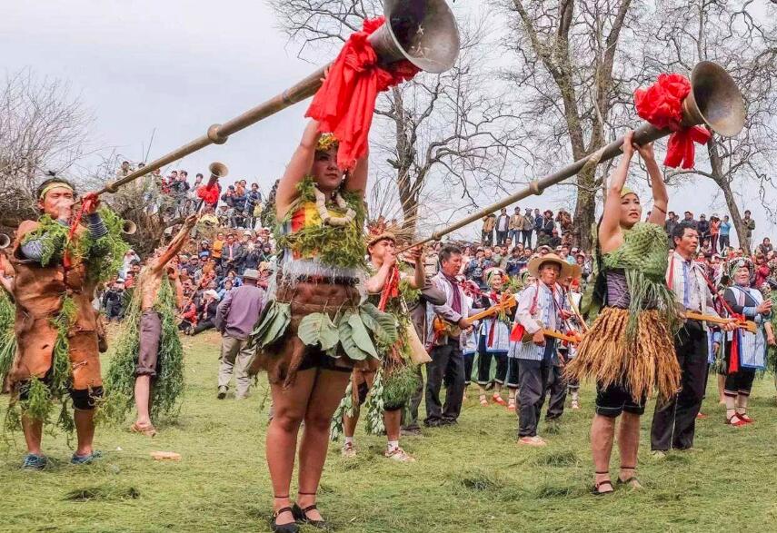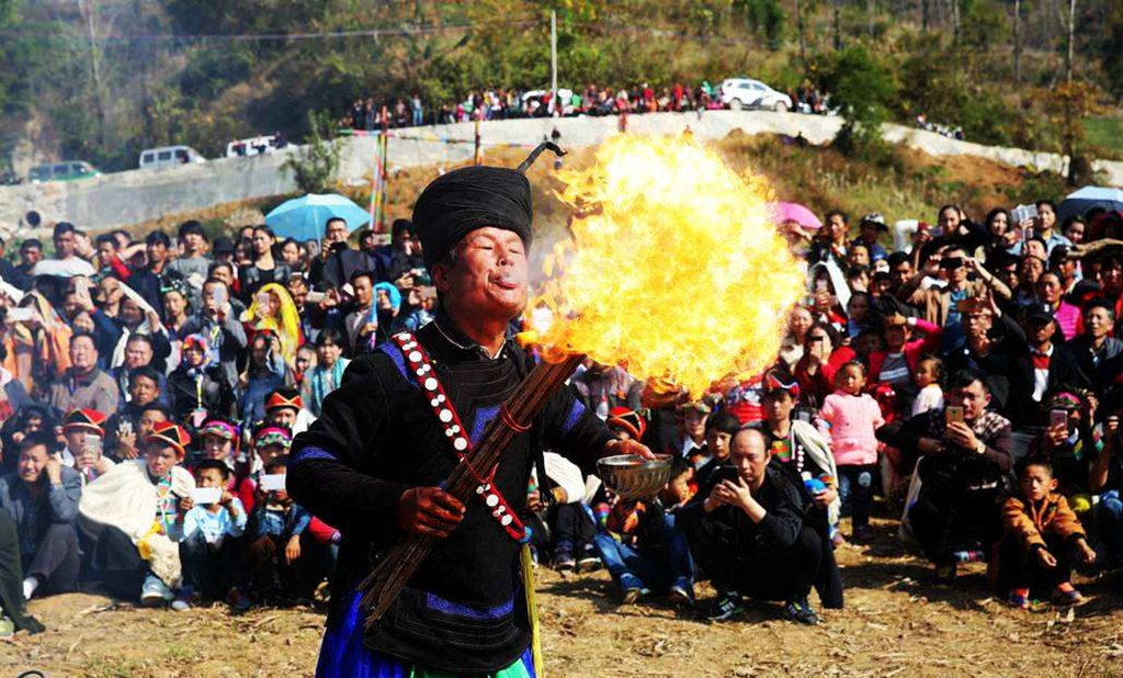 云南弥勒彝族阿细人一年一度的“祭火节”,又名“赤裸狂欢节”,非常传统的民族节日,充满了原始、新奇而神秘的色彩,青壮男赤裸用五色土的颜色纹身纹面,成群的少数民族群众齐聚载歌载舞,摔跤等各种独具民族特色的表演。文身遮面的男人,鱼贯跳过火堆、跨过火阵,将手中的木叉、枪棒投入火中,意味着除尽所有的灾害、污秽和邪魔。