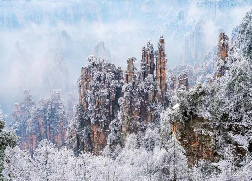 张家界雪景如诗如画、冬季天子山、黄石寨、金鞭溪、袁家界、杨家界构成了一幅纯净无暇的画卷/择机发团